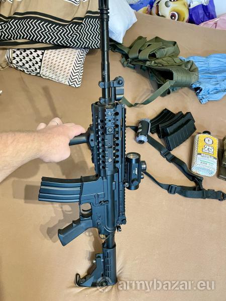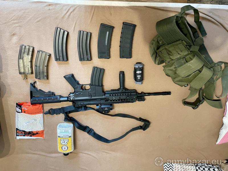 Popis: Jelikož se mi rozrostla rodina jsem "nucen" prodat svojí M4 v celokovu + vše na fotkách. Byla pořizovaná jako záložní, tudíž se s ní moc nehrálo. Je v ní CNC hop a přesná hlavneň (origo mám shovanou) Dále 4 tlačné zásobáky a 1 točák. 2 plničky, granát, opasek se sumkama, popruh. Baterie je Li-po 11,1, nabíječku přidám také. Jen zbraň je kolem 9k. M4 4500kč, kolimátor 1200, baterie 500, upgrade 1500 atd. O ceně jsem ochotný jednat. Preferuji osobní odběr.