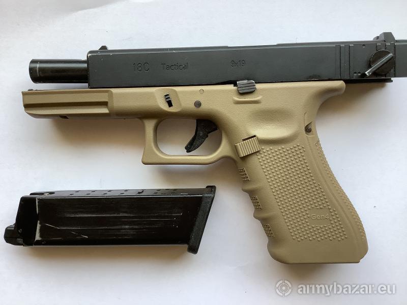 Popis: Prodám plynovou airsoftovou zbraň Glock 18 s blow back (na green gas). Kovový závěr a zásobník. Plně funkční, 4 měsíce stará, od firmy WE. Dvouřadý zásobník na 25 kuliček. Doporučená váha kuliček 0,25 g. Střelba možná jednotlivě i dávkou. Původní cena 3000,-